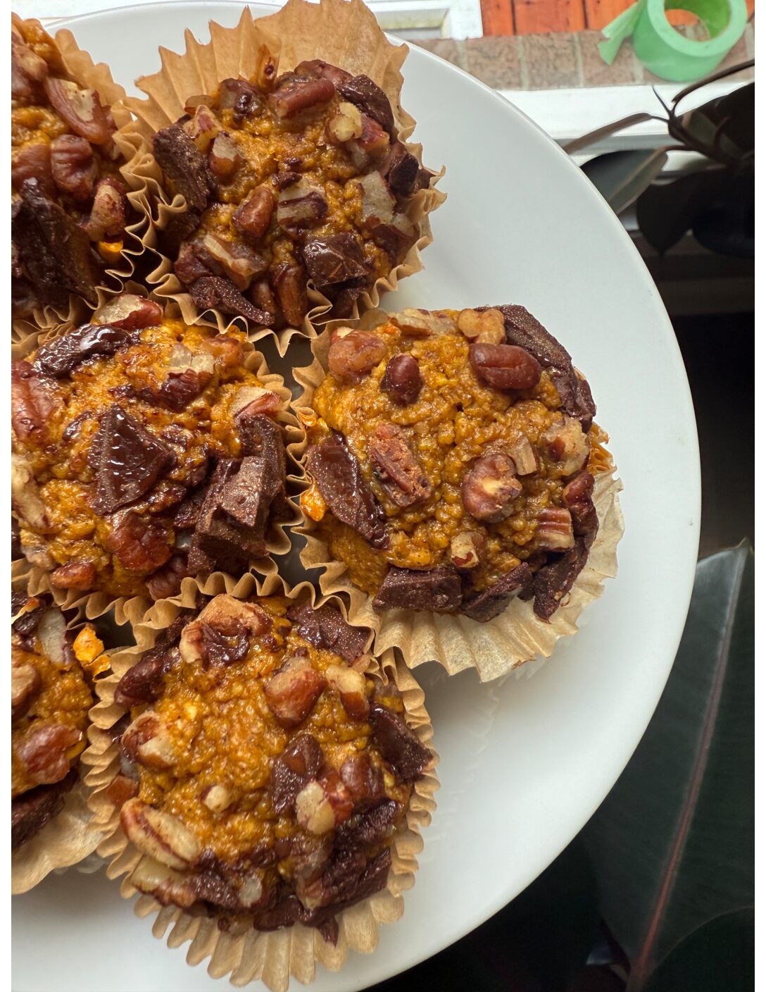 Sprinkle each muffin with some chopped pecans or other nut of choice + 4 squares of Lindtt dark chocolate or sea salted chocolate (chop the chocolates first on a cutting board)